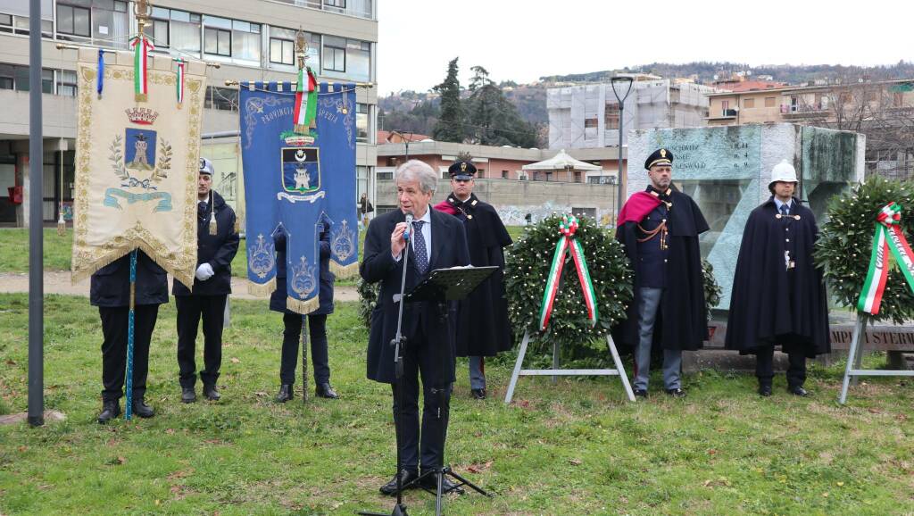 Le celebrazioni sono iniziate al mattino: la prima si è tenuta alle 9 alla presenza delle massime autorità provinciali e dei rappresentanti delle associazioni, con la deposizione di una corona d’alloro al Sacrario della Libertà dedicato ai caduti nei campi di sterminio nazisti, presso il complesso scolastico “2 Giugno”. In questo contesto il prefetto Cantadori ha ricordato che “Il rispetto è, oggi più che mai, una necessità per costruire un futuro e una società migliore, più giusta e più solidale, in cui il rispetto per la dignità umana divenga una priorità assoluta”. Inoltre, ha affermato che “Nel ricordo di quelle terribili sofferenze, abbiamo il dovere di riflettere e di rinnovare l’impegno – non solo oggi, ma ogni giorno dell’anno – a ricordare le vittime”.