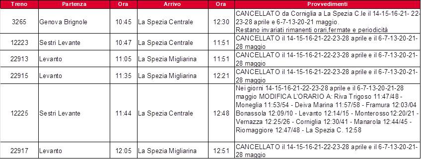 Rete ferroviaria italiana annuncia una serie di modifiche alla circolazione dei treni nella tratta La Spezia Migliarina – Corniglia per interventi infrastrutturali programmati alla Spezia centrale dalle ore 11.15 alle 12.30 nelle giornate del 14, 15, 16, 21, 22, 23, 28 di aprile e 6, 7, 13, 20, 21, 28 nel mese di maggio. “Rete Ferroviaria Italiana – Gruppo FS – a seguito delle modifiche rilevanti effettuate all’infrastruttura ferroviaria eseguirà lavori di completamento e di regolazione – si legge in una nota di Rfi -. Si tratta di lavorazioni da eseguire necessariamente quando la temperatura della rotaia raggiunge naturalmente i circa 30 gradi, condizione che si verifica nelle ore diurne tra aprile e giugno, prima che si sviluppino i caldi estivi. Nella fascia oraria di minor afflusso interessata dalle attività, e nei soli giorni feriali, tra le stazioni di La Spezia Migliarina e Corniglia la circolazione avverrà su un solo binario, dalle 11.15 alle 11.30 e sarà sospesa dalle 11.30 alle 12.30”. Questo comporterà le modifiche riportate nelle tabelle qua sotto: