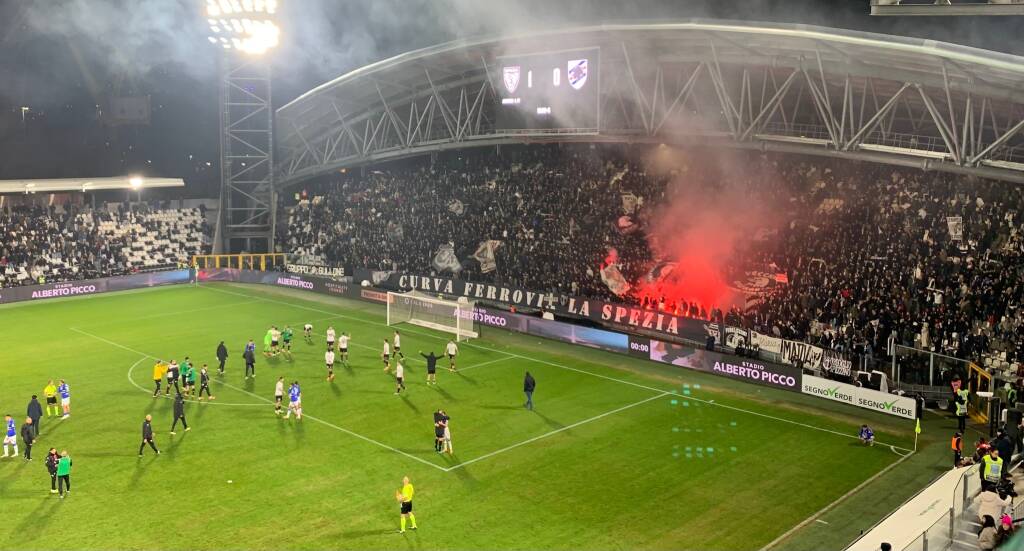 Non si attendono particolari valori tecnici e infatti non se ne vedono in campo sin dai primi minuti. Anzi, al 7° minuto Benedetti perde un pallone e deve fare fallo su Kouda per non rischiare. Dalla seguente punizione Beruatto scodella in area dove Mateju colpisce di testa per una deviazione di mano di un Hadzikadunic. Protesta lo Spezia e protesta il Picco, ma per il Var Giua non ci sono gli estremi per l’on field review.